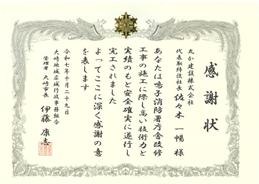 庁舎内覧会の際には、大崎地域広域行政事務組合管理者である大崎市長より工事完了に対する感謝状を贈呈いただきました。